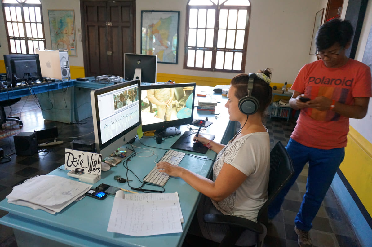 Het kantoor van Bicicleta ligt om de hoek van het centrale plein van Masaya. Voor de deur staat altijd een bewaker; er zijn verhalen bekend van gewelddadige gewapende overvallen op tv-bedrijfjes. Maar vandaag wast hij, om iets te doen te hebben, de auto van editor Femke Klein Obbink (34). Zij zit binnen onder de airconditioning met een koptelefoon op achter twee grote schermen. Redacteur José Collado (28) is in de weer met spreadsheets en bonnetjes. Biemans heeft de muren van zijn eigen kantoortje beplakt met isolatiemateriaal. Hier neemt hij zijn voice-overs op.