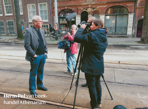 Dit alleen om een pro vpro-commercial te kunnen opnemen met Herm Pol, chef van de nabijgelegen boekhandel Athenaeum. Althans, daar lijkt het op, maar het verkeer blijkt omgeleid vanwege wegwerkzaamheden. Komt dat even goed uit. ‘Waar is het voor,’ vraagt een passant. ‘vpro-lid worden,’ antwoordt de cameravrouw. ‘Ben ik al,’ zegt de voorbijganger, ‘sinds 1991. Koot en Bie. Succes.’