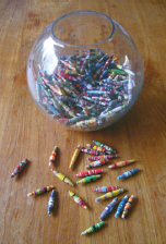 Niets blijkt echter minder waar. Creatieve lezers zorgen voor een groeiende reeks bijzondere vormen van hergebruik. Nu zijn er zelfs VPRO Gids-kralen. Die worden gemaakt door trouwe abonnee Gabriëlle Wiggers uit Maurik. Hoe zit dat? ‘De VPRO Gids lees ik van de eerste tot de laatste pagina. Op dinsdag valt-ie op de mat, zaterdag heb ik hem helemaal uit. Tijdens het tv-kijken doe ik graag iets nuttigs en maak ik van de covers papieren kralen. De gidscovers hebben mooie kleuren en precies de goede lengte en papierdikte.’ Wat gaat u daar mee doen? ‘Die kralen zijn bedoeld voor een vliegengordijn in mijn keukendeur. Nou kijk ik hooguit één keer per week televisie, dus het is een langetermijnproject. Voorlopig sla ik vliegen nog gewoon dood met de hele VPRO Gids.’