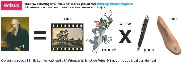 Deze nogal ronkende woorden schreef Marja van Ravenstein bij de door haar ingestuurde oplossing van rebus 18. Alsof het om de snelste tijd gaat! Het is geen schaatsen of ander onzinnig haastvermaak maar puzzelen. En buiten dat, hoe zou de jury dit moeten controleren? Daarnaast is het natuurlijk voor ons vijfkoppige rebusteam niet zo prettig om te horen dat een week werk in een halve minuut ongedaan wordt gemaakt.