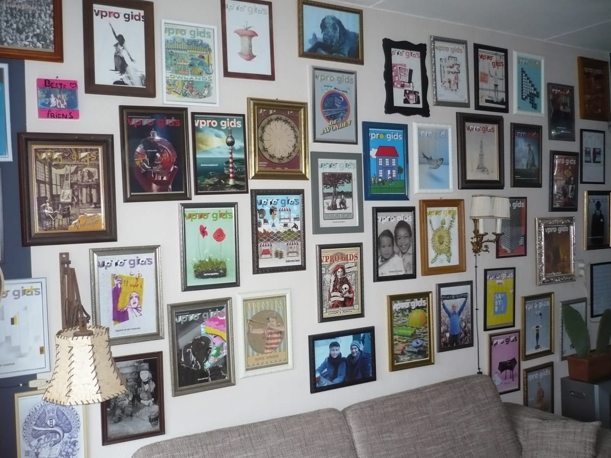 Van de Laar: ‘Ik ben er in 2013 mee begonnen. Omdat ze te mooi zijn om weg te doen en omdat ik na een schilderbeurt een kale muur had. Alle 51 covers van 2013 hangen er plus nog drie privéfoto’s. Van mijn vriend, van mijzelf en een van onze zwarte labrador Makaay.