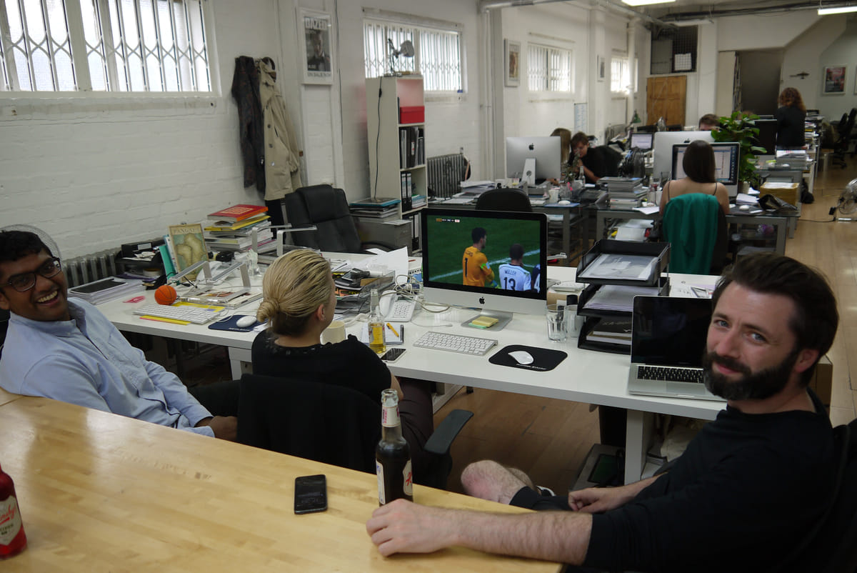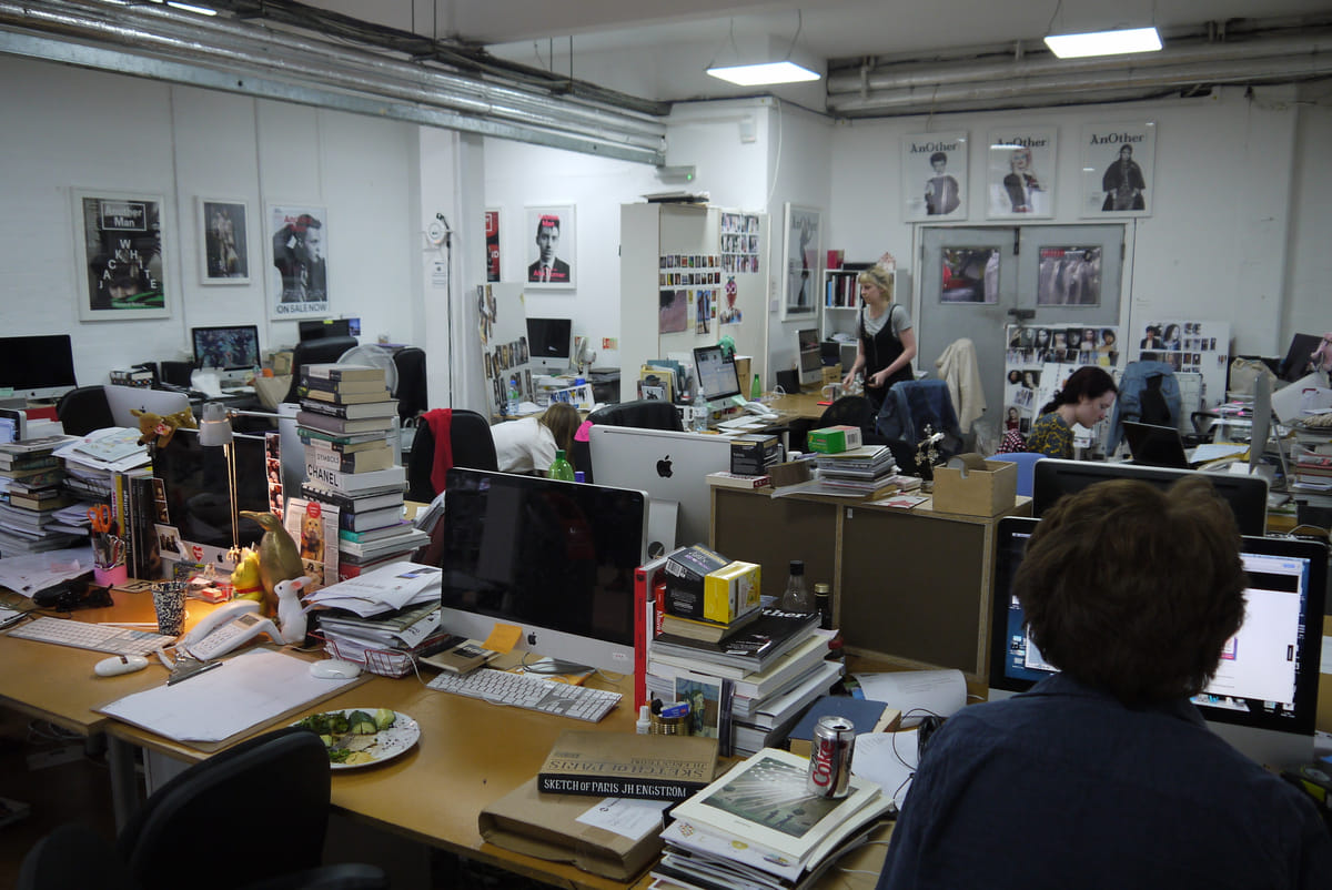 Er mag dan een duidelijk verschil zijn tussen het soort inhoud dat beide platforms van de titel leveren, de stukken hebben hetzelfde DNA en daarom heeft Noakes de digitale en de printredacties bij elkaar gevoegd. Iedere redacteur werkt voor beide media. Noakes geeft een rondleiding. Er wordt afwisselend hard gewerkt en voetbal gekeken. De bureaus zijn een creatieve rotzooi: naast Apple-computers staan boeken hoog opgestapeld en liggen losse vellen papier en tijdschriften verspreid tussen kartonnen lunchzakken en borden met etensresten. ‘Hier werkt Jefferson Hack,’ wijst