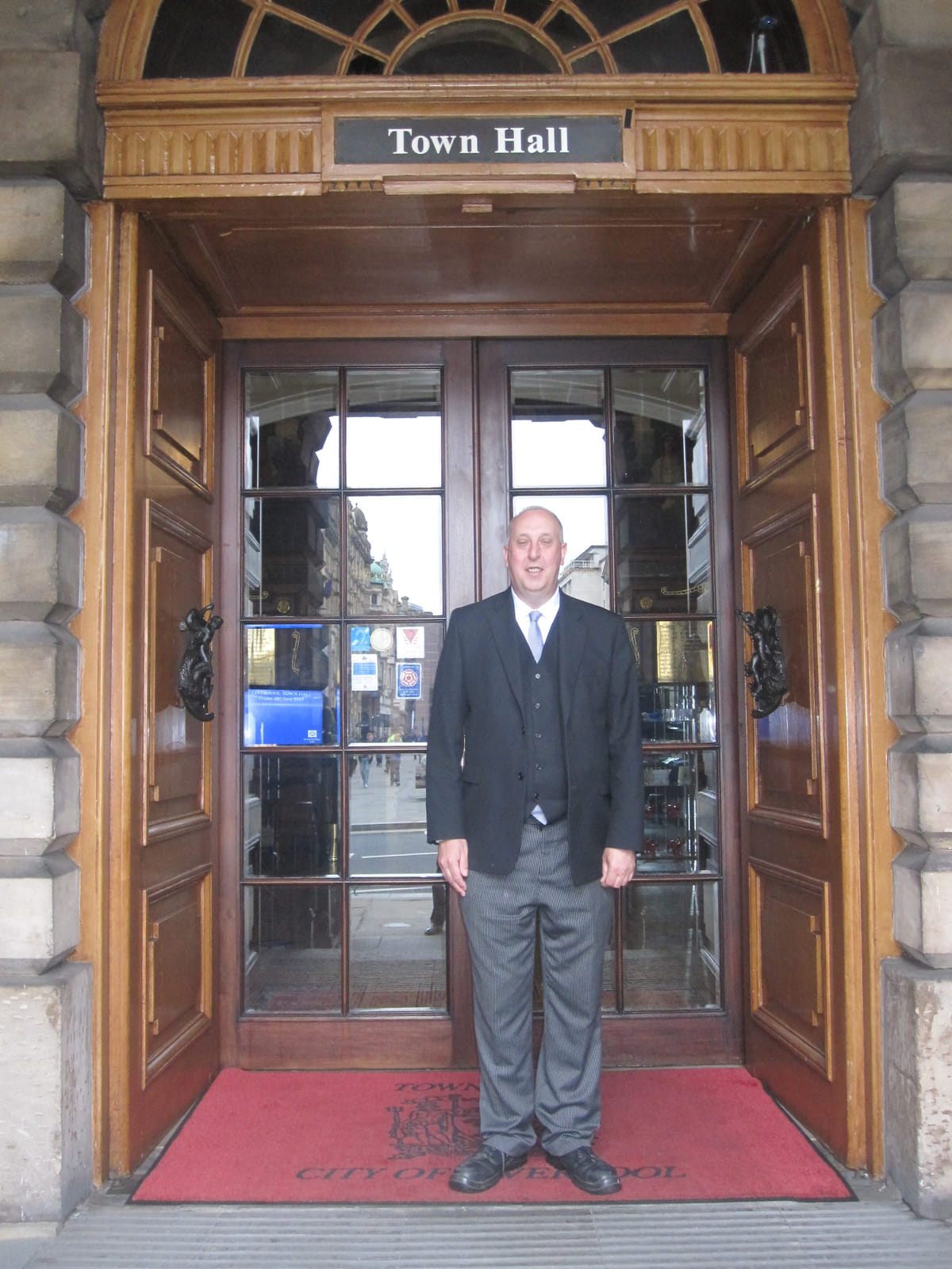 Robert Franks staat al 34 jaar bij de deur van dit achttiende-eeuwse monumentale gemeentehuis, dat nog altijd als zodanig in gebruik is. Scouser Franks is trots op zijn stad en begint een lang verhaal over de geschiedenis, die rond 1200 bij King John begint. Hij prijst het kosmopolitische karakter. Wisten we bijvoorbeeld dat de oudste Chinese gemeenschap van Europa hier gevestigd is? De Chinezen waren hier volgens Franks zelfs al voor King John. Op de voor de hand liggende vraag hoe die hier dan verzeild raakten, volgt een niet geheel overtuigende uitleg. Gelukkig kwamen we daar niet voor. We willen weten hoe hij over Liverpool Waters denkt. Is hij voor of tegen? Franks antwoordt als een volleerde diplomaat: ‘De stad heeft deze investering nodig en het aangezicht zal niet echt beschadigd worden, zolang het smaakvol gedaan wordt. We zouden het heel erg vinden als we de werelderfgoedstatus zouden verliezen, maar ik ben heel positief gestemd over de toekomst van de stad.’