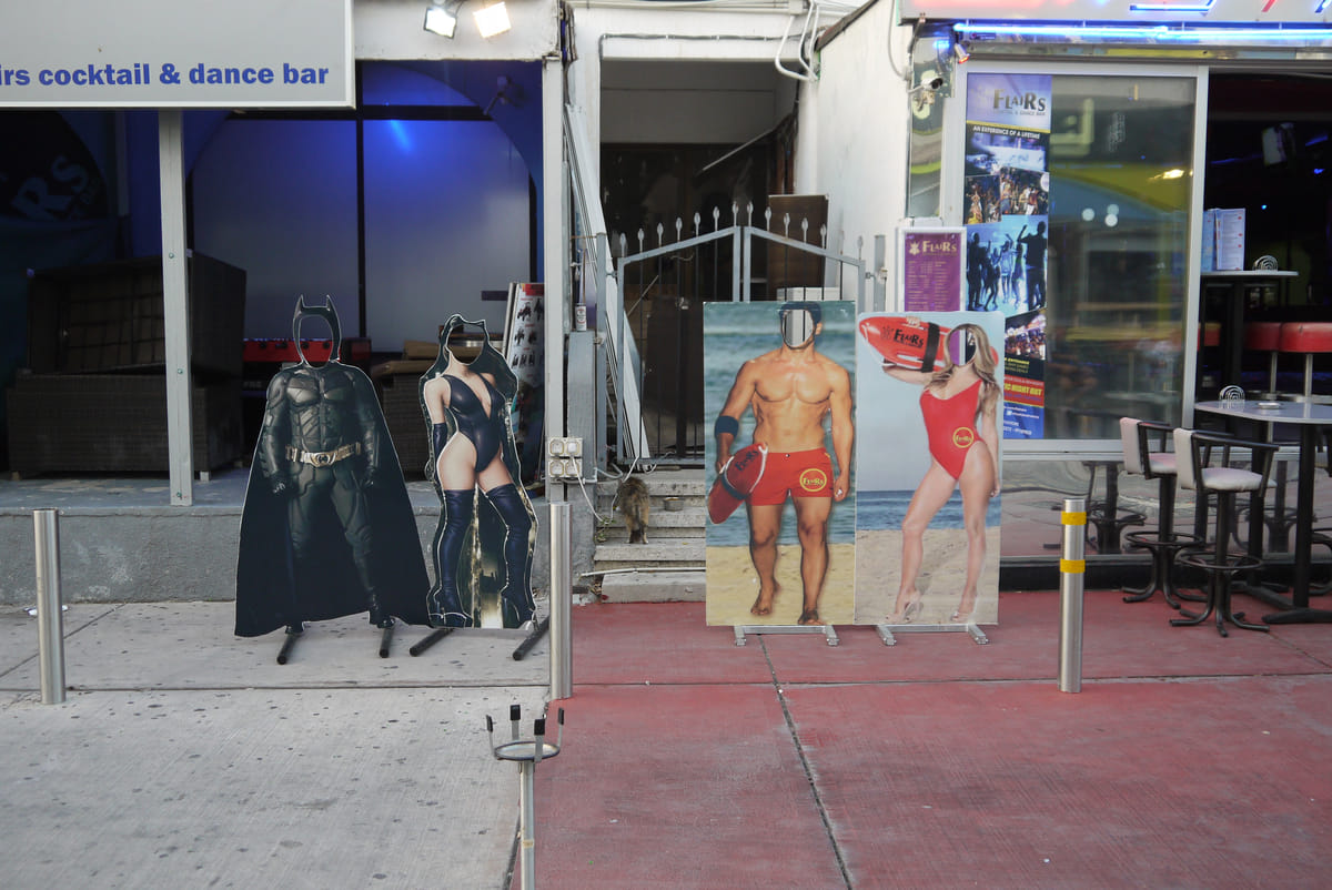 ‘Bar Street’ – zo wordt de straat pal achter de boulevard in de volksmond genoemd, vanwege de vele bars en clubs die er huizen of hebben gehuisd. Donkere gaten gapen tussen neonverlichte tenten waaruit goedkope house knalt en waarvoor Britse proppers flyeren om publiek naar binnen te krijgen, met deals voor ultra goedkoop zuipen. Happy hours, lapdances, stripshows, imitatie Elvis Presleys en Michael Jacksons – alles wordt uit de kast getrokken om het publiek te verleiden. Het is half twaalf ’s avonds, tijd voor een borrel of om de heupen los te gooien – zou je zeggen. Bij cocktailbar Baywatch zit een overwegend gepensioneerd publiek wezenloos te kijken naar drie meiden die een Lady Gaga-act neerzetten voor een rookkanon. Daarna volgt een stripact. De tent ertegenover adverteert aan de gevel met vuurshows en kooidanseressen, maar de kooi is leeg en de bar ook. Ook bar Flairs is nagenoeg leeg: twee man en een paardenkop. Brian Webb, de fors gebouwde en getatoeëerde manager, wijt dit voor een deel aan de all inclusive hotels, die houden hun gasten binnen met eigen clubs met entertainment. De andere reden hangt er voor een deel mee samen: door de crisis zoeken mensen een goedkopere vakantie. Als ze al uitgaan, gaan ze een of twee keer in hun vakantie op stap, in plaats van elke nacht zoals voorheen. Ook de andere hedonistische plek op het eiland, Ayia Napa, heeft hier last van.