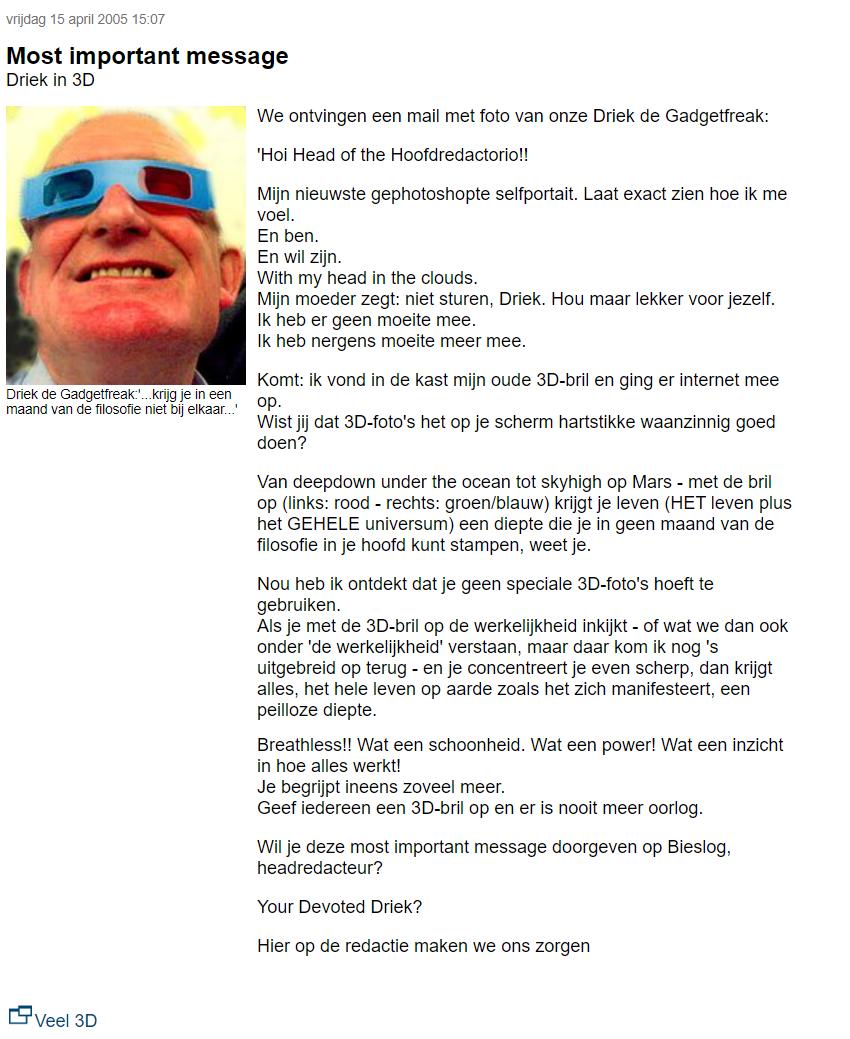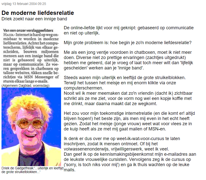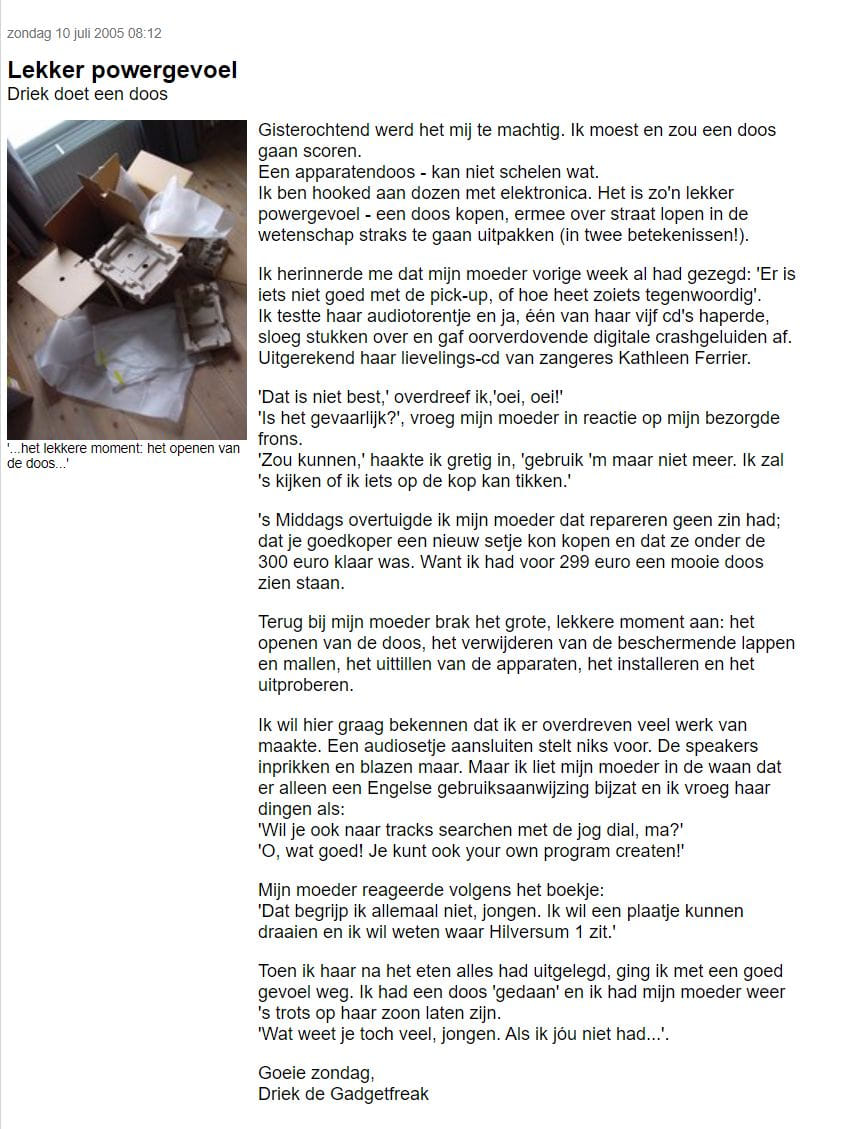 We kunnen het niet over vernieuwers hebben zonder het te hebben over Driek de Gadgetfreak. Dit typetje van Wim de Bie, bedacht voor zijn eigen blog (het Bieslog), was zijn tijd ver vooruit. Al in de vroege jaren 2000 unboxte hij en deelde hij selfies. Het Bieslog is onlangs opgedoken uit de krochten van het verloren internet en is is in volle glorie hersteld. Hier hebben we driemaal Driek voor je op een rij gezet, maar duik daarna vooral zelf in de bijdragen van de Dingetjesman.