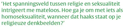 ‘Het verhaal van die jongens wilde ik tonen. Kon helaas niet, want de Nederlandse moslimhomo’s willen niet op camera, ze schuwen de openbaarheid. Sommigen zijn bang voor de sociale omgeving; ouders en familie. Anderen besluiten op een eigen manier invulling te geven aan hun seksuele en religieuze identiteit: het Nederlandse model van coming-out past hen niet, ze emanciperen op hun eigen manier. Vaak kennen ze hierdoor een halve coming out. Een broertje, zusje of moeder weet er dan van, de rest niet. Toen ben ik moslimhomo’s in Marokko gaan zoeken. Want het spanningsveld tussen religie en seksualiteit intrigeert me mateloos. Hoe ga je om met iets als homoseksualiteit, wanneer dat haaks staat op je religieuze denkbeelden?'