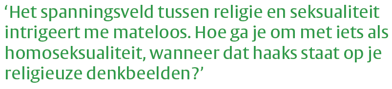 ‘Of die twee films over homoseksualiteit typisch het navelstaren van mijn generatie is? Ik geloof van niet, ik denk dat het niet anders kan dan dat je eerste film altijd heel dicht bij je zelf ligt. Als je jong bent zoals ik ben je nog niet goed in staat om dingen meta te duiden. Maar mijn derde film gaat waarschijnlijk over een lesbienne en haar zus die moslima werd. Dat is echt een nieuwe wereld voor me, iets dat ver van me af staat.’ Lachend: ‘Want ik om nou te zeggen dat ik veel met vrouwen heb…’