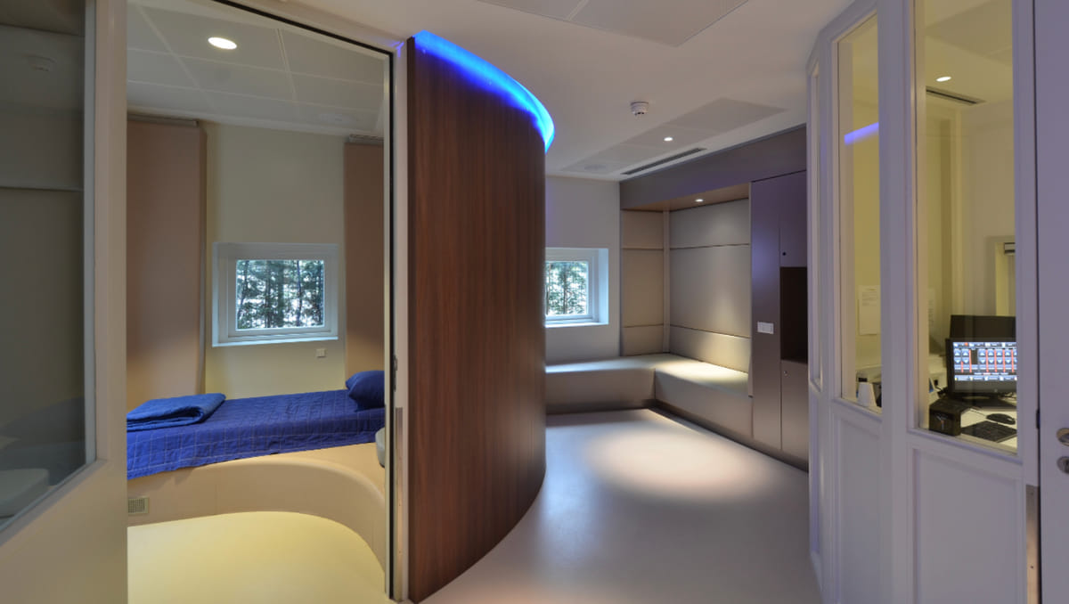 Dat betekent: een zacht loungebed om op te liggen, kleedjes in allerlei kleuren en een afstandsbediening om zelf de sfeerverlichting en muziek te kiezen. Nog een belangrijk detail: er zit geen draaiende deur in, maar een schuifdeur. Francesco: ‘Bij een schuifdeur kun je zelf bepalen hoe ver je de deur openzet. En het klassieke angstaanjagende geluid van een zware deur die in het slot valt mag niet meer door de gangen klinken.’