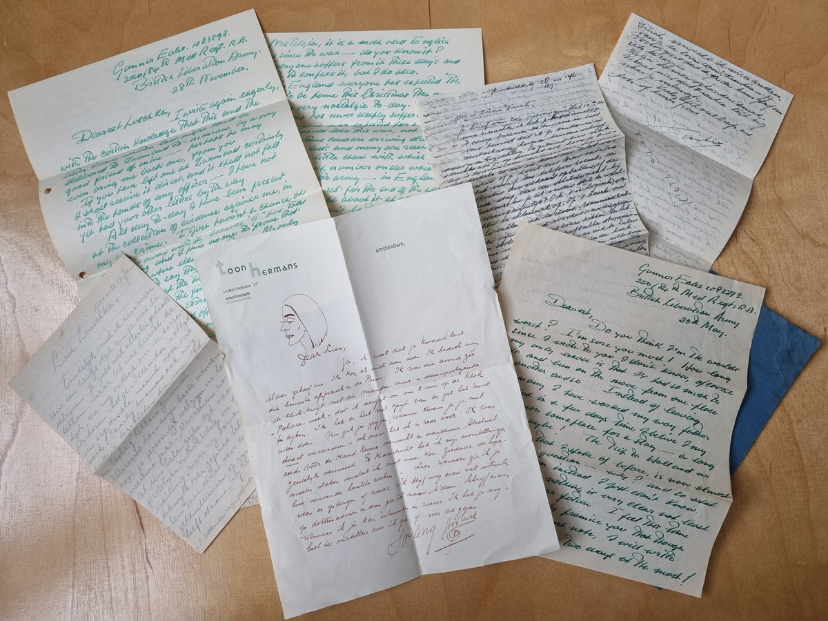 Heeft Lies zich veel aangetrokken van dit ultimatum? Het lijkt er niet op. De ruim 45 afzenders van de brieven lijken allemaal te snakken naar haar liefde en aandacht. Pakken met keurig genummerde enveloppen komen er uit de dozen, geschreven tussen 1940 en 1952. Er zijn dunne luchtpostenveloppen bij, kaartjes en dubbel beschreven A4’tjes. Vaak in de sierlijke handschriften die men in de vorige eeuw nog had. Er is een pak brieven van Max en Mia, een bevriend stel dat Lies wilde interesseren voor het socialisme. De getrouwde Britse Edward schreef kantje na kantje vol aan zijn ‘dearest Loeschka’. De dikste stapel is van Joop, die als soldaat gestationeerd was in Nederlands-Indië. Hij noemt zichzelf in zijn brieven ‘Frankie’ en spreekt Lies aan met ‘Dinah’, alsof ze het filmsterrenkoppel Frank Sinatra en Dinah Shore zijn.