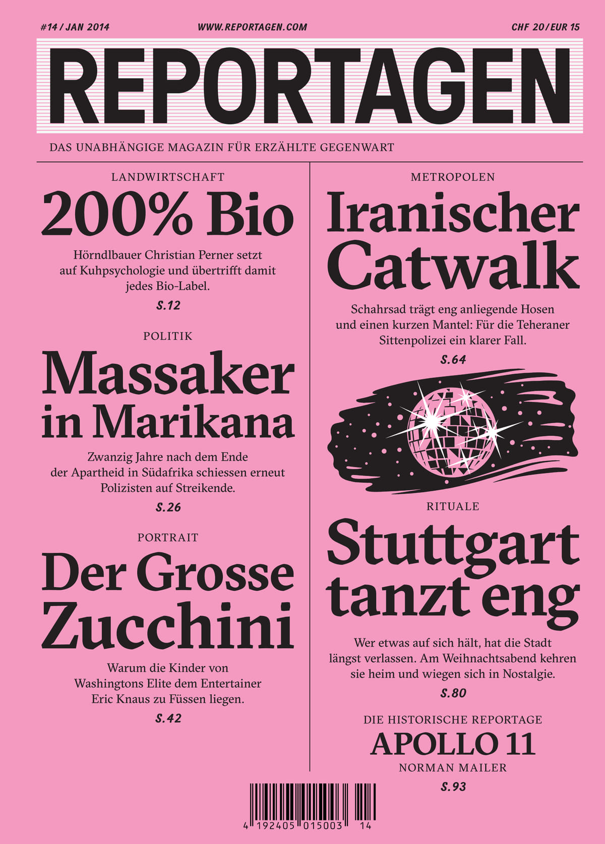In Reportagen staat geen enkele foto. Voor de motivatie daarvan moeten we naar Zürich, een uurtje geruisloos zoeven met de comfortabele trein door het groene berglandschap. In het economisch centrum van Zwitserland wordt het straatbeeld bepaald door dure zonnebrillen, pakken en hondjes. Ontwerpbureau Moiré zit in een wat alternatiever gedeelte van de stad, met een backpackershotel, een Turkse stomerij en een homobar als buren. Het kantoor boven een schimmige stripclub ziet er met tafelvoetbalspel en graffiti op de muren precies zo uit als je van een ontwerpstudio mag verwachten. Moiré is vanaf het begin nauw betrokken bij Reportagen. Ze ontwierpen speciaal een lettertype, geven opdrachten aan illustratoren en maken infographics. Marc Kappeler (38), een van de drie oprichters, rookt bij het schuifraam sigaretten. Hij draagt slobberige kleren en instappers zonder sokken. Hij heeft flink wat strijd moeten leveren tot de redactie akkoord ging met het fotovrije ontwerp en kan de argumenten nog zonder moeite opnoemen. ‘Ik was ervan overtuigd dat we om een kans te maken op de bladenmarkt een uniek en duidelijk profiel moesten hebben. Het tijdschriftschap ligt vol met glossy magazines met veel fotografie. Maar op dit formaat en papier komen foto’s niet goed uit. Bovendien kun je tegenwoordig één foto eigenlijk niet meer geloven. Fotojournalisten werken daarom met uitgebreide projecten en vertellen hun verhalen in grote dossiers. Daar zijn andere media voor.’ Met de nadruk op lang lezen van papier gaat Reportagen toch al tegen de stroom in, dus besloot Kappeler dan maar alle regels overboord te gooien. ‘Als je niet graag leest, koop je dit niet. Maar voor die mensen is het blad toch niet bedoeld.’ Zijn vasthoudendheid werd beloond; Moiré won in 2013 de prestigieuze Design Preis Schweiz.