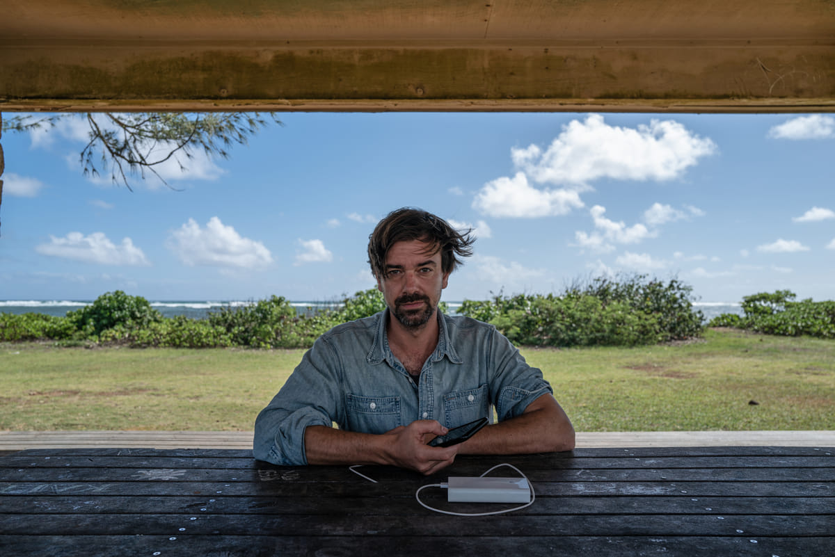 'Maar deze foto zegt voor mij ook iets over hoe we te werk gaan. Met op dat moment niet meer dan Dennis, ik, de regisseur en de cameraman. En een telefoon en een powerbank. Dit is namelijk het moment dat de hele bodem onder ons plan vandaan zakte. We waren naar het eiland gekomen voor Jesse: ogenschijnlijk een succesverhaal van een jongen die opgekrabbeld was en nu afgekickt op een paradijselijk eiland een paradijselijk leven ging opbouwen. Dat leek ons prettig, om zo'n positief verhaal te brengen in een soms toch zware serie.