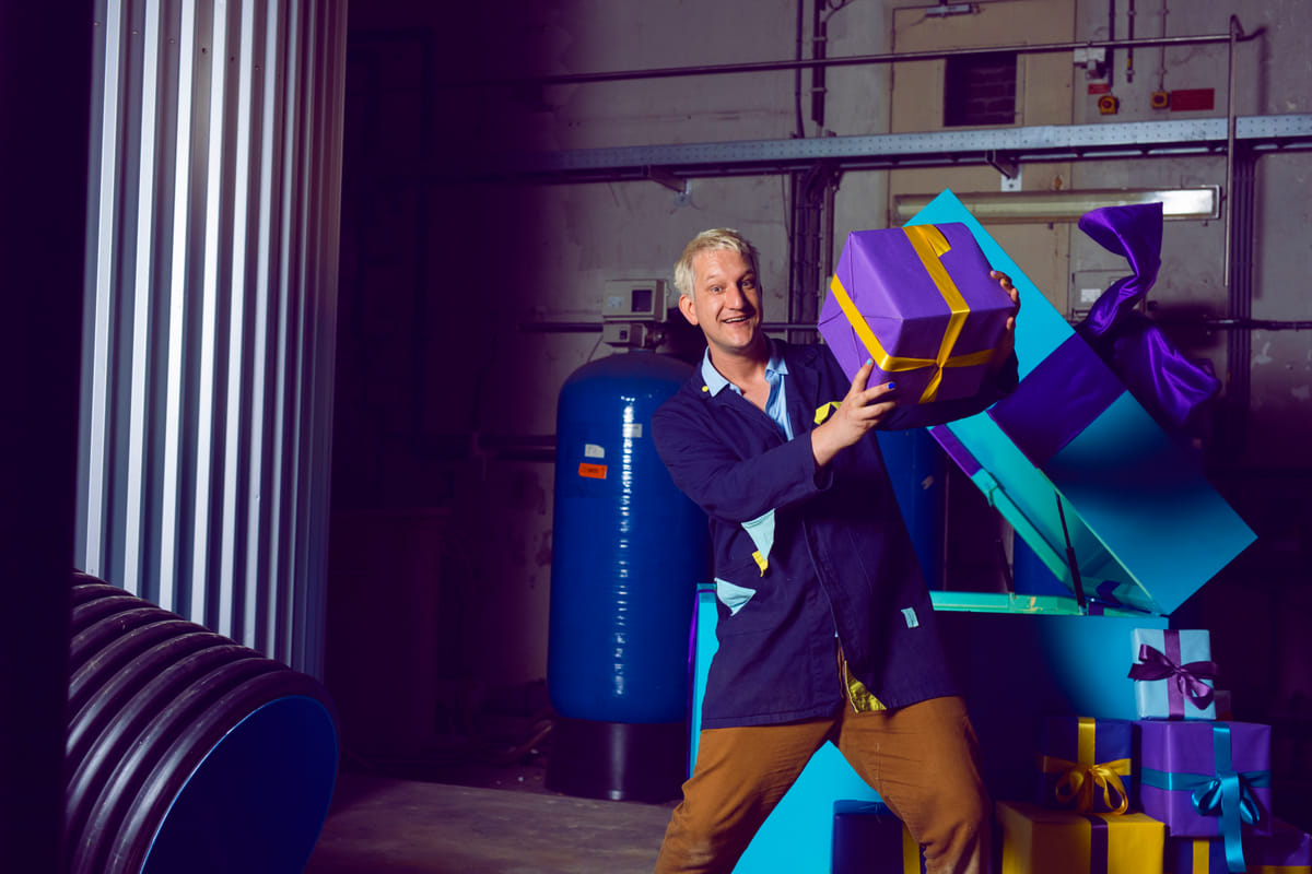 De cadeaufabriek is een te gekke plek: met kleurrijke, mysterieuze machines én met kunstenaar Maarten Bel maken kinderen een uniek cadeau voor een belangrijk persoon. ‘Het geven van een cadeau gaat niet over de waarde in geld, maar over het inleven in de ander, de moeite die je doet en het ontwikkelen van je creativiteit.’