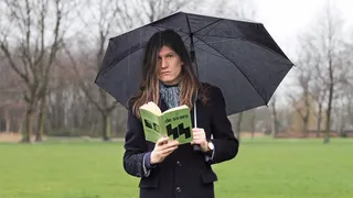 De druppels kletteren zachtjes op de rand van de paraplu. Onder de paraplu staat Jerry Hormone. ‘Ik lees graag in de zomer in het Vroesenpark’ had hij ons gemaild. Hoewel het geen zomer is, staat hij wel op zijn favoriete leesplek. In de regen.