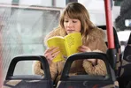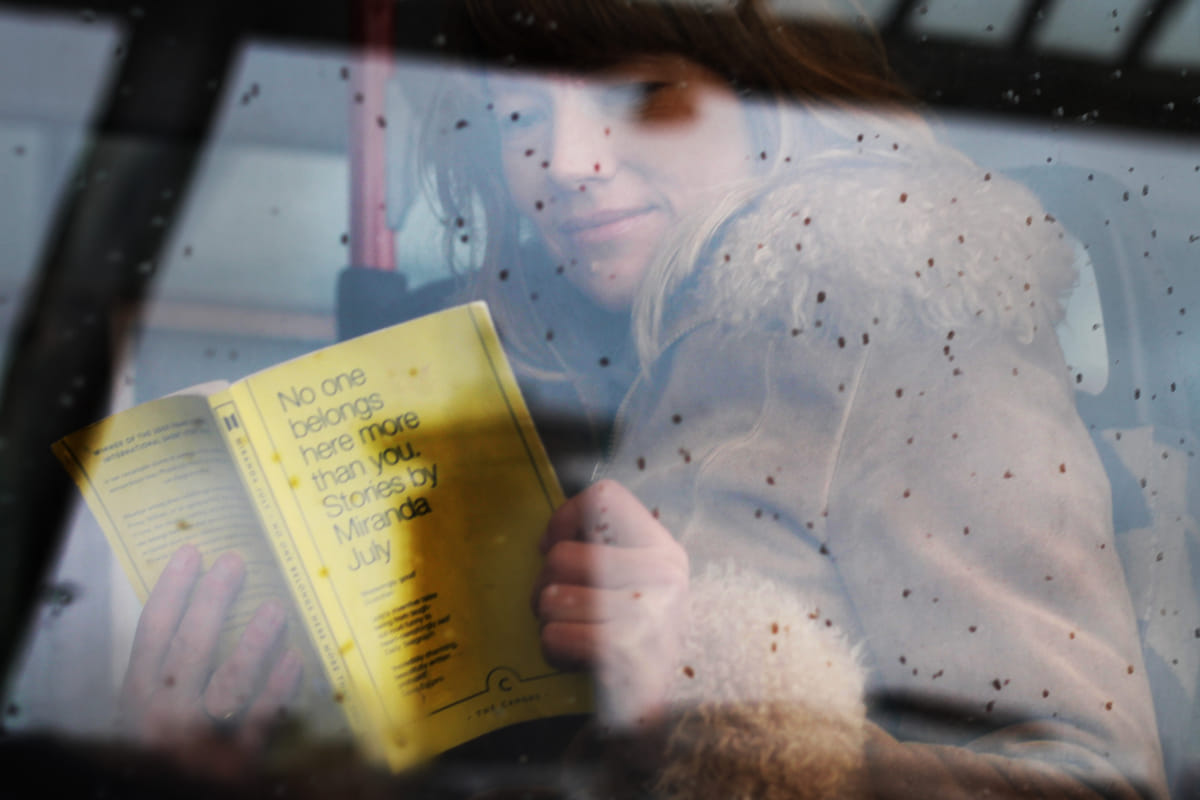 Op de foto leest Esma No one belongs here more than you van Miranda July. Haar vrouwelijke vorm van absurde humor vindt Esma inspirerend. ‘Ze trekt je in een bepaalde manier van denken die dan in mijn eigen hoofd ook doorgaat. Je gaat allemaal verbanden leggen die je normaal nooit zag.’ Terwijl ze zich met Miranda July in de bus nestelt maken we de foto’s. Al snel verschijnt er een lach op Esma’s gezicht, wat waarschijnlijk de trance zal zijn. Later die dag krijg ik een mailtje: ‘Ik heb mijn telefoon, sleutels en handschoenen in de bus laten liggen.’ Misschien is die trance tijdens het lezen dus toch niet altijd even handig.