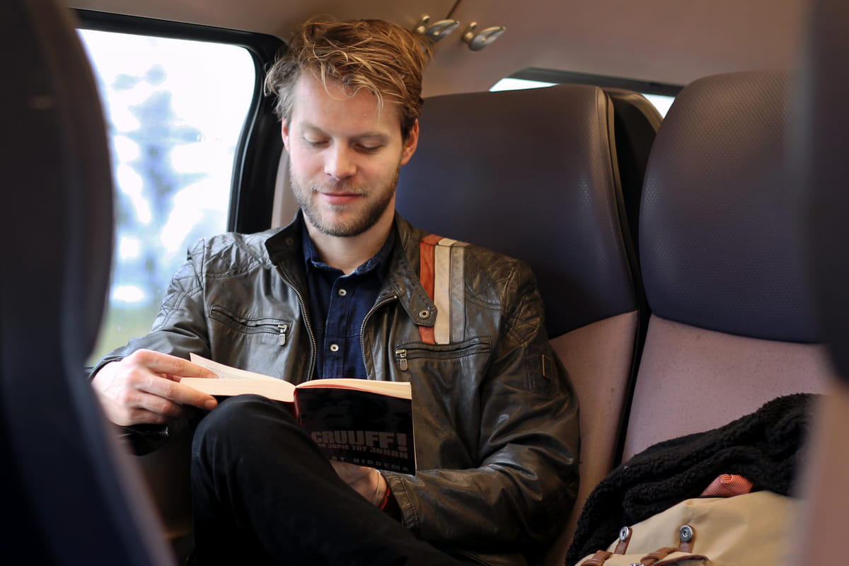‘Hoe kun je nou schrijven maar niet lezen? Dat is net zoiets als dat je zou zeggen: ik hou wel van voetballen maar niet van trainen.’ En daarom leest schrijver Philip Huff wel twee tot drie uur per dag. Het liefst op een rustige plek, zonder afleiding. In de trein bijvoorbeeld, waar de beweging en het zachte geluid voor rust zorgen. ‘De omgeving moet je niet interessanter maken dan wat je aan het lezen bent.’