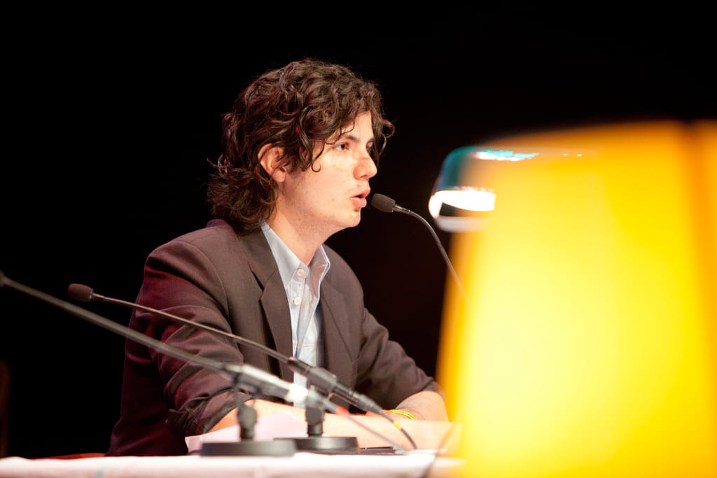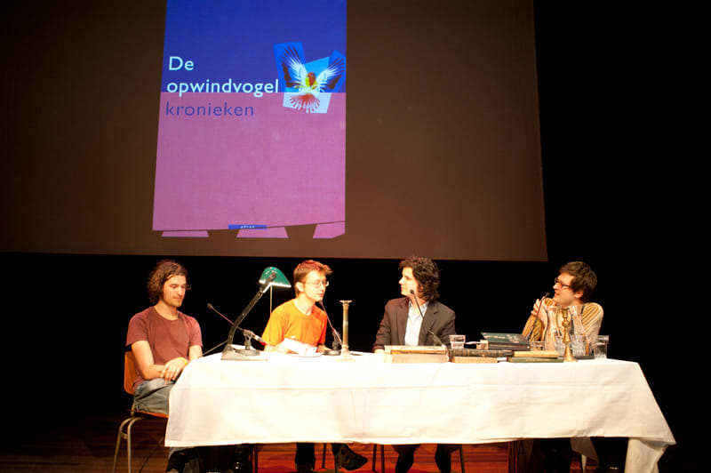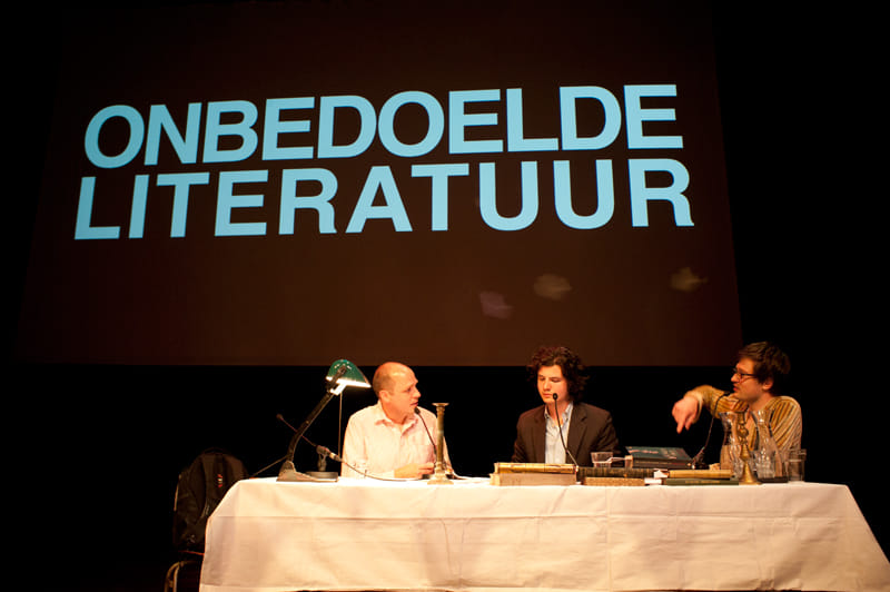 ‘We zijn begonnen met een podcast vanuit een bejaardentehuis. Steeds wanneer een bejaarde overleed kwam er een student in het tehuis, om het zo uiteindelijk op te kunnen doeken.’ Met deze woorden begint Ernst-Jan Pfauth de editie van Literaturfesteditie op het Boeken Festival. Pfauth heeft Literaturfest – samen met Toine Donk en Tim de Gier – uitgebouwd tot een populaire podcast die het bejaardentehuis inmiddels is ontgroeid en nu in het Amsterdamse culturele centrum De Rode Hoed wordt opgenomen. Voor het VPRO Boeken Festival staan de Literaturfesters echter voor één keer in De Brakke Grond. Hun aanpak is echter onveranderd. ‘Met drie jongens praten over boeken’, zo omschrijven Pfauth, Donk en De Gier hun methode op hun website, en dat is precies wat ze doen.