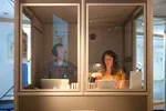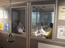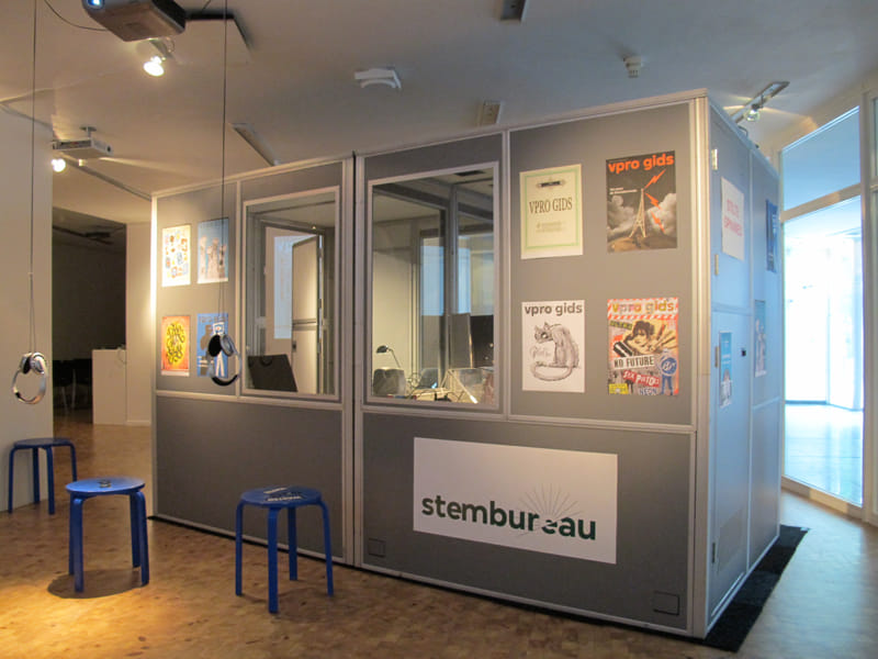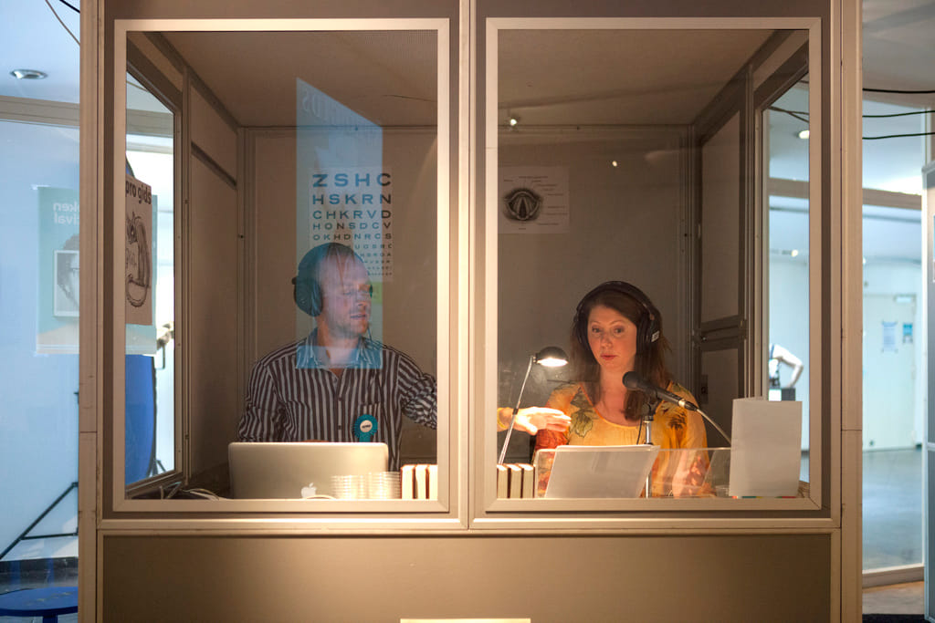 Er stonden drie zeer fraaie cabines opgesteld waarin kon worden geoefend en opgenomen. De kandidaten mochten eerst tien minuten met Arjen en Sjoerd wennen aan hun eigen stem en kregen alvast wat tips over leestempo en dergelijke. Daarna kwamen ze bij mij om in tien minuten de opname te maken.