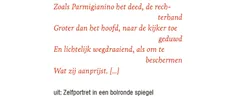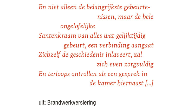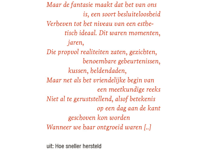 Dat gebrek aan betekenis in een ons bekende vorm is misschien meer een gevolg dan een doel. Wat Ashbery doet, is verschillende werelden mengen. Niet per se om de lezer in de war te brengen, maar om een soort verhevigde realiteit tot stand te brengen. Denken is ordenen, en soms lukt het om de chaos van alledag tot een gedachte om te vormen. Vaak slagen we daar echter helemaal niet in en blijven we zitten met fl arden en schimmen die op de een of andere manier indruk op ons maakten en ons zijn bijgebleven. Ashbery voert ons naar dat woelige en amorfe gebied waar de gedachte nog gevormd moet worden. Een gebied waar herinneringen, fantasieën, dromen, verlangens, mijmeringen, dagelijkse beslommeringen en wat al niet meer hun plaats opeisen.