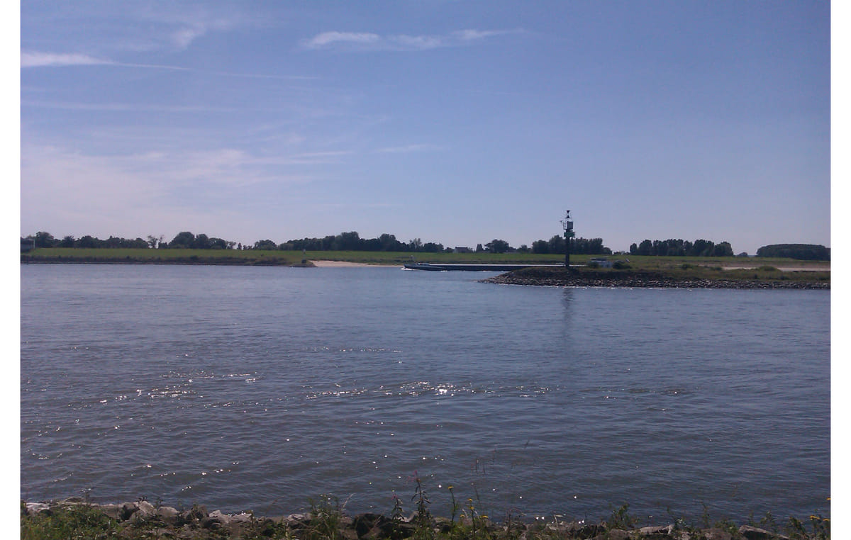 Ik volgde de IJssel, Nederrijn, Pannerdensch Kanaal, Boven-Rijn en gewone Rijn. Hier de plaats waar het Pannerdensch Kanaal zich afscheidt van de Boven-Rijn.