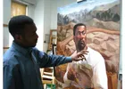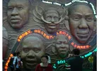 Shanghai – Binnen rijst een rotsige wand op waarin Afrikaanse gezichten zijn geboetseerd; in de neusgaten van twee ervan zitten botten. Tussen de hoofden kronkelt een lichtreclame met de tekst: African smile, shining from ancient to modern times. Human civilisation, radiating from Africa to the world.