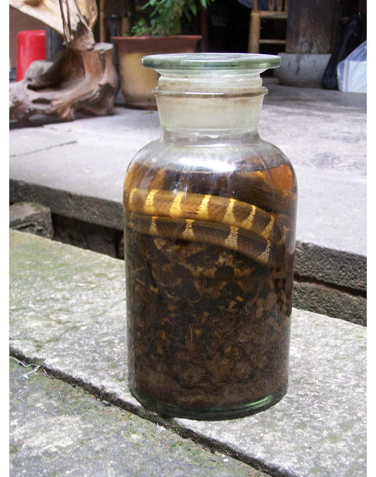 Bagua Cun – De bokaal met het drankje wordt uit het kamertje gehaald en op de grond gezet. Op een royaal bed van donkerbruine kruiden ligt een dikke, opgekrulde slang, zijn vel zo glanzend en gezond dat het is of hij slaapt.