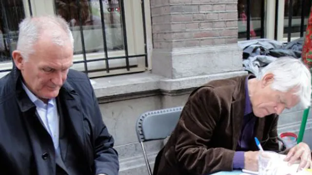 Voor wie meer wilde werd het boek wordt buiten verkocht. ‘Als er nog enkele oude exemplaren zijn,' voegde De Bie hieraan toe. Hierna was het tijd voor zijn signeersessie met zijn collega Kees van Kooten: ‘Die heeft wél een nieuw boek!’