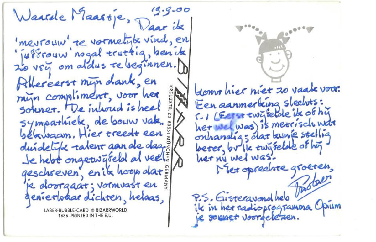 Maartje Duin woonde als student bij de plezierdichter om de hoek en sprak hem eens op straat aan. Ze schreef een sonnet over hun ontmoeting, dat ze aan hem gaf. Drs. P las het voor tijdens het radioprogramma Opium en dat was de start van een jarenlange, bijzondere briefwisseling en vriendschap. De laatste gesprekken die Duin met hem had, nam ze op en zijn te horen in de documentaire.