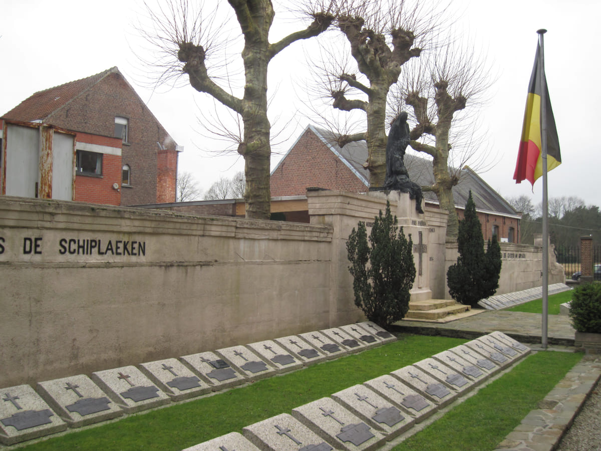 ‘Opnieuw is het stil; je hoort de wind in de kale bomen. Het is bijtend koud. Bij de ingang van het kerkhof hangt de vlag slap als een dode vogel. Ik maak foto’s van het monument – een lange muur waarop in ijzeren zwarte letters te lezen staat: AAN DE HELDEN DER GEVECHTEN VAN SCHIPLAEKEN.’