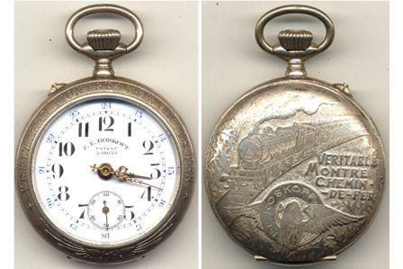 Het (tijd)bepalende zakhorloge uit Oorlog en terpentijn is er een van het merk Roskopf. Om zakhorloges te verkopen huurde Georges Frederic Roskopf in 1867 de diensten in van Charles Léon Schmid. Deze had het briljante idee om zakhorloges aan te bieden aan spoorwegmaatschappijen. Er werden aparte kasten ontworpen met een afbeelding van een trein: de 'Chemin de Fer' zakhorloges.