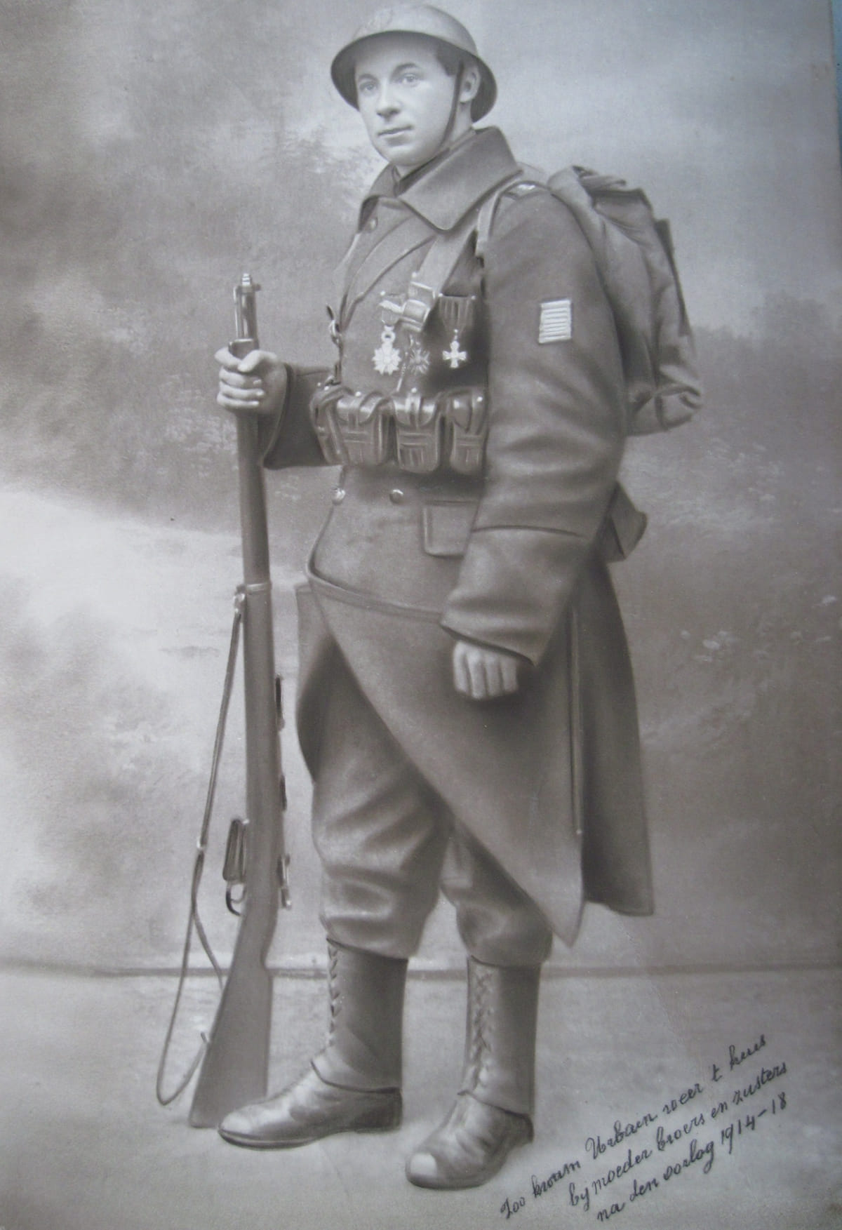 'Voorhanden is alleen het grote, ingelijste portret in zwart-wit waarop hij in uniform te zien is, wellicht een uitvergroting van een net na de oorlog gemaakte foto, die bewerkt is met houtskool en waarvan ik altijd had gedacht dat het een tekening betrof, zo vaag en omfloerst zijn sommige lijnen. Onder aan de ingelijste foto heeft hij zelf geschreven: ‘Zoo kwam Urbain terug uit den oorlog 1914-1918’.'