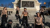 Deze foto is gemaakt op 27 januari 2023 in het El Retiro Park Madrid, Spanje. Activisten van #FEMIN demonstreren tegen femicide.