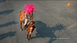 An Indian policeman wearing a virus themed helmet rides on a horse during an awareness rally aimed at preventing the spread of new coronavirus in Hyderabad, India, Thursday, April 2, 2020.