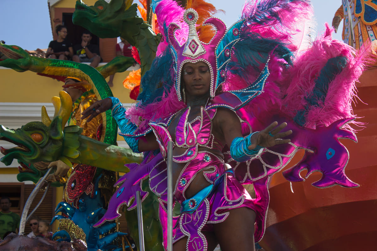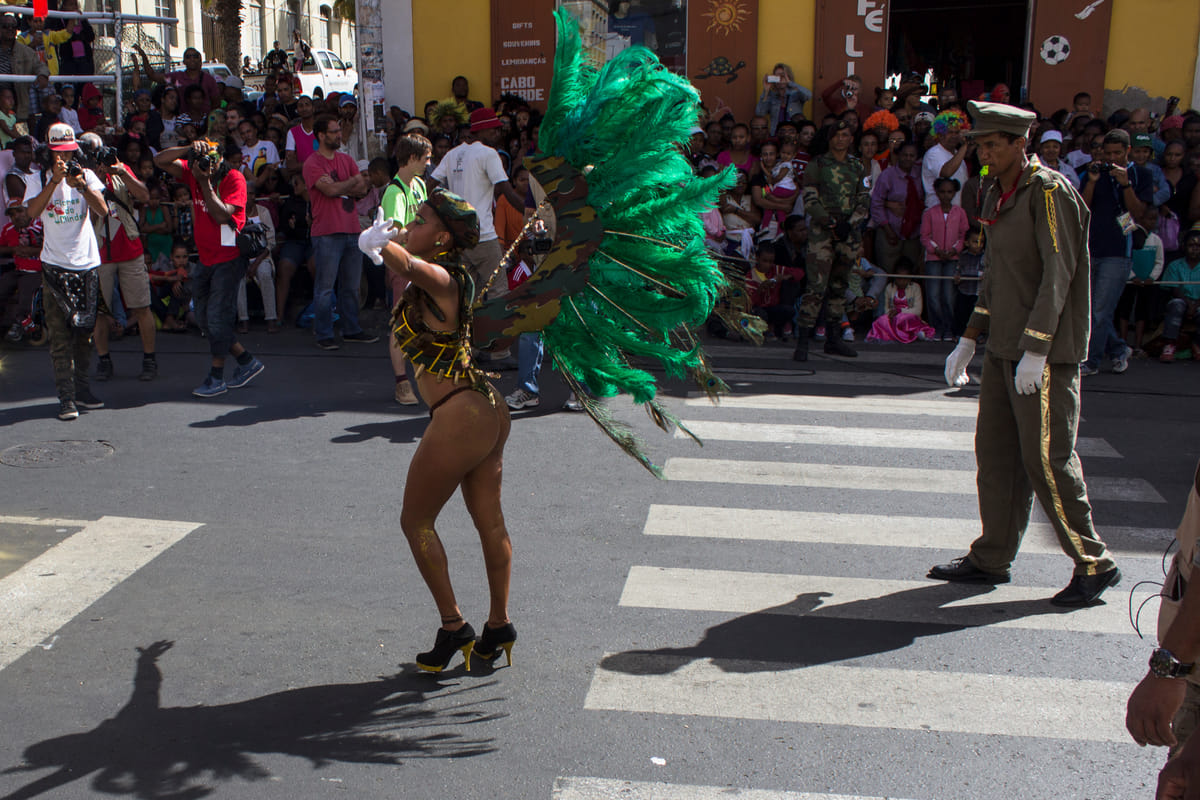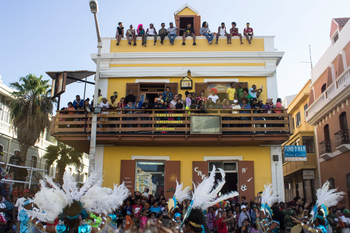 Felgroene kostuums verlichten de smalle straten van Mindelo, São Vicente, Kaapverdië. Ogen zijn nog niet gewend aan deze verzadiging, of de volgende stoet vol knalroze gekleurde mensen komt aangelopen. Dansende vrouwen, kinderen en stoere mannen paraderen langs de caranavals-hongerige menigte aan de kant; glimlachend, wuivend, knipogend en verleidelijk dansend. De toeschouwers staan als sardientjes in blik op balkonnetjes, zitten in de dakgoot en op aangedragen tribunes. De nationale feestdag van dit kleine eiland is een enorme happening.