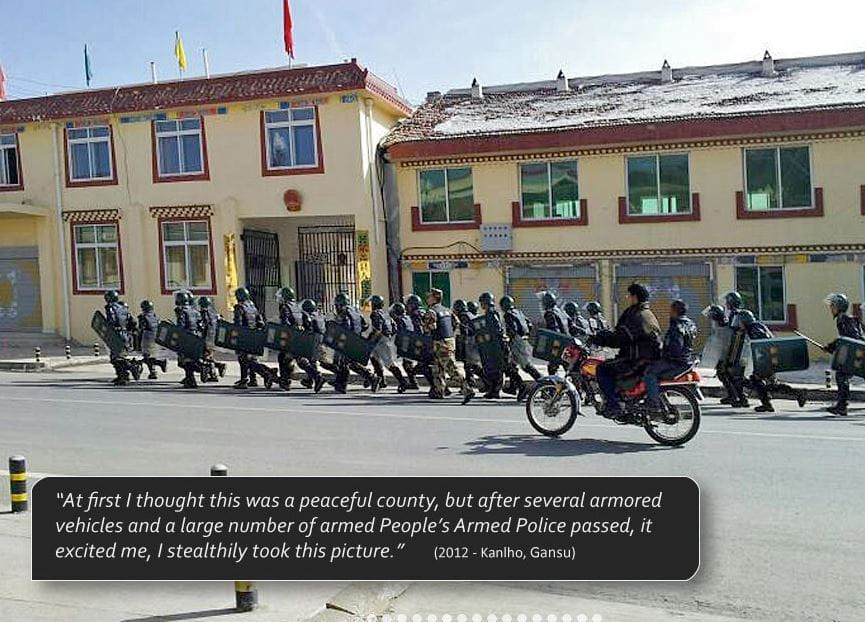 Rollende tanks, oproerpolitie en checkpoints. The International Campaign for Tibet vond op de Chinese twitter en miniblog site Weibo foto's die Chinezen zelf hadden gefotografeerd in de Tibetaanse Autonome Gebieden en er iets buiten. Het bewijs van onderdrukking door de vijand zelf geleverd.