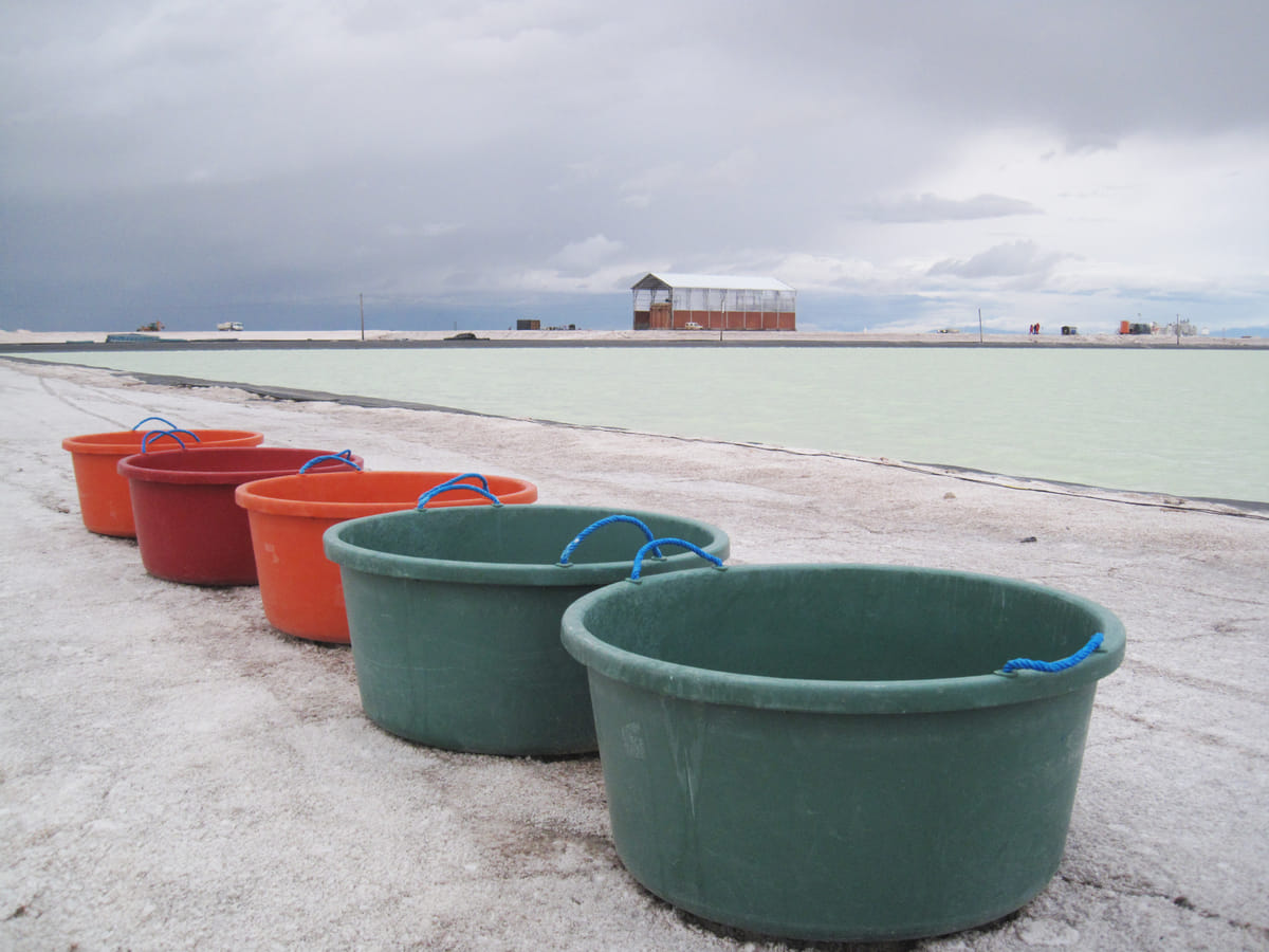 ‘De staat wil het lithium niet verkopen. Het idee is alles in handen van de Bolivianen te houden,’ zegt ingenieur Johnny Alejo van staatsmijnbouwbedrijf Comibol. Zijn terreinwagen hobbelt over de dijk. Links en rechts strekt de zoutvlakte zich uit. De korst is tijdelijk bedekt met een laagje water vanwege de hevige regenval. In de verte staan iglo-vormige onderkomens voor de werknemers. ‘Liever dan het te verkopen willen we er zelf een product van maken; batterijen, misschien elektrische auto’s.’