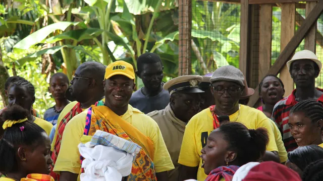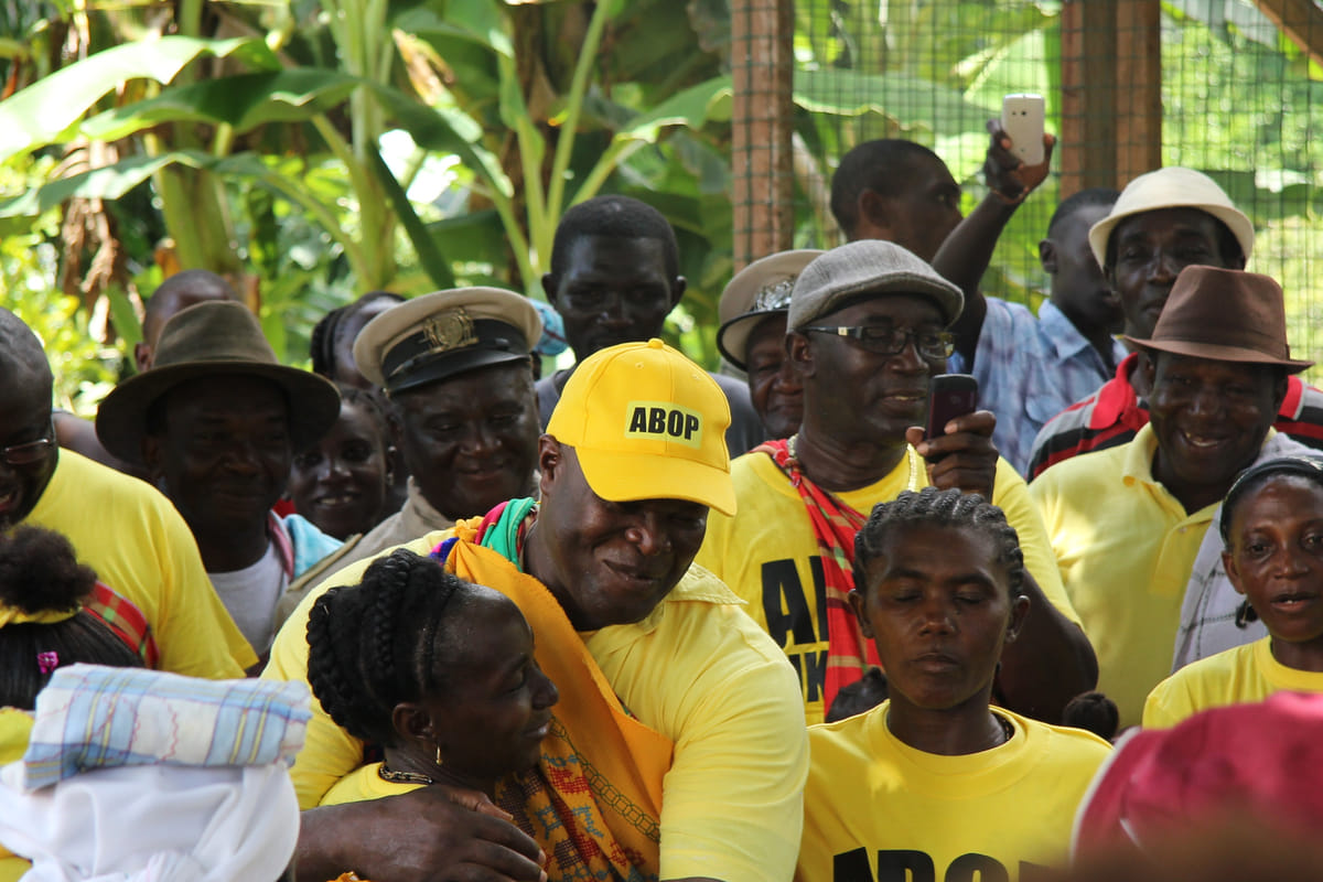 Op het centrale grasveld heeft zich een schare trouwe aanhangers verzameld van de ABOP, de Algemene Bevrijdings- en Ontwikkelingspartij. Haast iedereen draagt een nieuw felgeel T-shirt van de tweede regeringspartij van Suriname. Het ontvangstcomité bestaat uit de hoofdkapitein van Pikin Slee, zijn basja's en de raad van ouderen die de families van het dorp vertegenwoordigt.