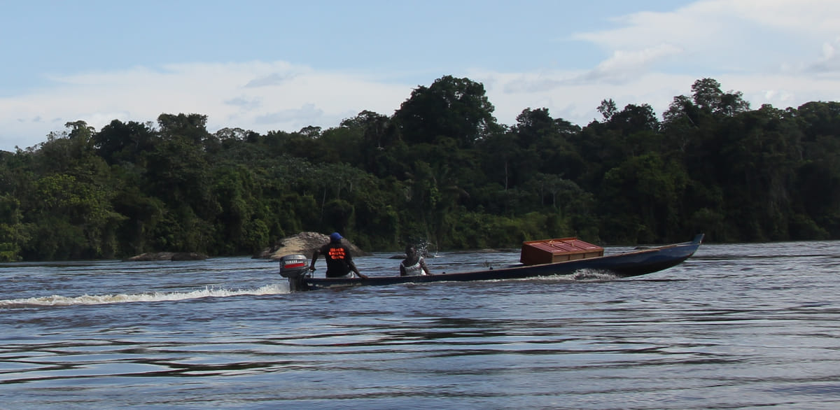 Het is kwart over één als boven de stroomversnellingen van de Boven-Surinamerivier het geronk aanzwelt van een oude legerhelikopter. Als in een openingsscène van een nieuwe film van Oliver Stone scheert de heli laag over de toppen van de kankantries in het regenwoud van Saramacca, een gebied onder het Brokopondostuwmeer, 200 kilometer ten zuiden van Paramaribo. Na twee rondjes landt het toestel op het centrale voetbalveldje van Pikin Slee, met 4000 inwoners een van de wat grotere dorpen hier aan de Boven-Surinamerivier in het binnenland van Suriname.