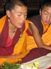Hier hangt een aparte sfeer en je kunt als buitenstaander een beetje benaderen hoe geloof en eensgezindheid hen bindt. Voor het hoofdaltaar staat op een zandmandala een beeld van Sakyamuni, de historische Boeddha die onderwees dat iedereen een boeddhanatuur heeft en de verlichting kan bereiken. Hij wordt omringd door meditatieboeddha’s (dhyani’s), boterlampjes en torma’s. Deze witte, kegelvormige deegofferandes van gedroogde gerstebloem zijn met tekeningen in boter versierd. Door hun speciale krachten helpen ze honger, ziekte en epidemieën bestrijden. In een lange rij staan koperen schaaltjes met zuiver water en kommetjes met graankorrels en wierookstokjes als traditionele offerandes.