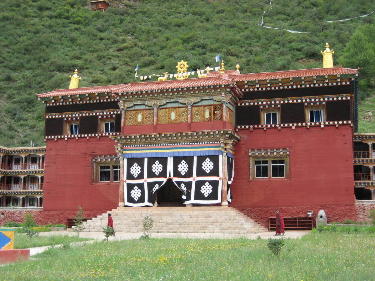Op het binnenplein groeten we het 3 m hoge beeld van Sakya Pandita, die in de 13de eeuw Tibet behoedde tegen het Mongoolse geweld. Verscholen tussen de bosschages op de bergflank achter het hoofdgebouw zien we een schuilplaats waar monniken zich kunnen terugtrekken om te mediteren. Door mentale training trachten zij in afzondering hun geest te verfijnen zodat ze niet meer handelen onder invloed van emoties en misvattingen. Zuiver licht en leegte zijn voor hen het meest subtiele niveau dat de geest kan bereiken.