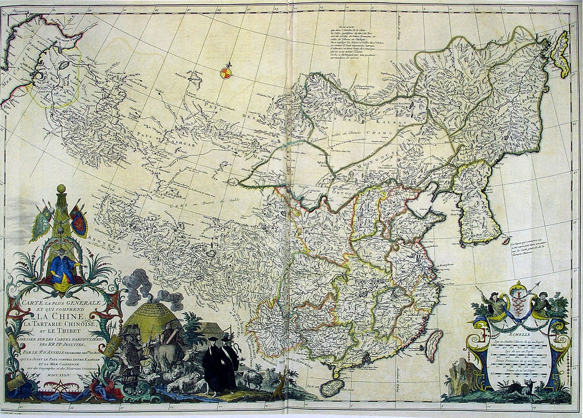 De kaart van cartograaf Jean-Baptiste Bourguignon d'Anville - en gepubliceerd door een Duits drukker - toont historisch China. Oftewel het centrale gebied dat al eeuwenlang wordt gedomineerd door Han-Chinezen. Niet op de kaart staan onder meer de regio's Xinjiang, Mongolië, Mantchoerije. En heet hangijzer: Tibet. Een bewuste prik van Merkel, of gewoon een beetje naïef? Hoe dan ook: een rel is geboren.
