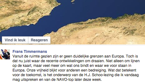 Dat is hem gelukt, als minister van Buitenlandse Zaken. Timmermans is een fervent gebruiker van Facebook, en daar zie je hoe immens populair hij is onder het Nederlandse volk. En bij collega's in Den Haag en Brussel geniet hij veel aanzien. Vooral zijn optreden in Oekraïne, deze zomer, rond de ramp met de MH17 en zijn emotionele voordracht kort daarna voor de Verenigde Naties leidden tot lofuitingen.