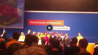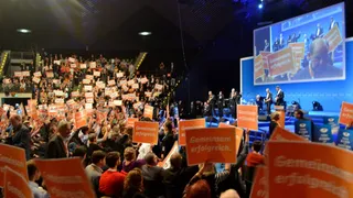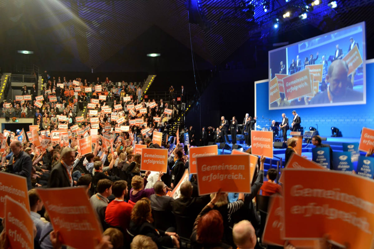 Op vrijdagochtend 20 september stap ik een andere wereld binnen: één van oranje t-shirts, hippe slogans, oude mensen en totale ordening en stylisme. We vallen wat uit de toon tussen de gepensioneerde christendemocraten in grote getalen naar dit conferentiecentrum zijn gekomen om Angela Merkel te horen speechen - en dat is dan ook precies de reden waarom we, na uitgebreid te hebben meegezongen met 'We are family' en 'You’re simply the best', het podium op gesommeerd worden.