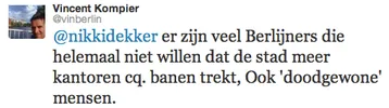 Berlijn is arm aber sexy, en lijkt daarmee vaak op de verlopen, excentrieke jongeren die ze aantrekt: sympathiek en creatief, maar uiteindelijk weinig productief en al helemaal niet winstgevend. Die jonge ondernemers komen dus veelal inspiratie halen, maar wanneer ze geld willen verdienen, en besteden, trekken ze weer weg. Vincent Kompier betwijfelt of dat erg is: