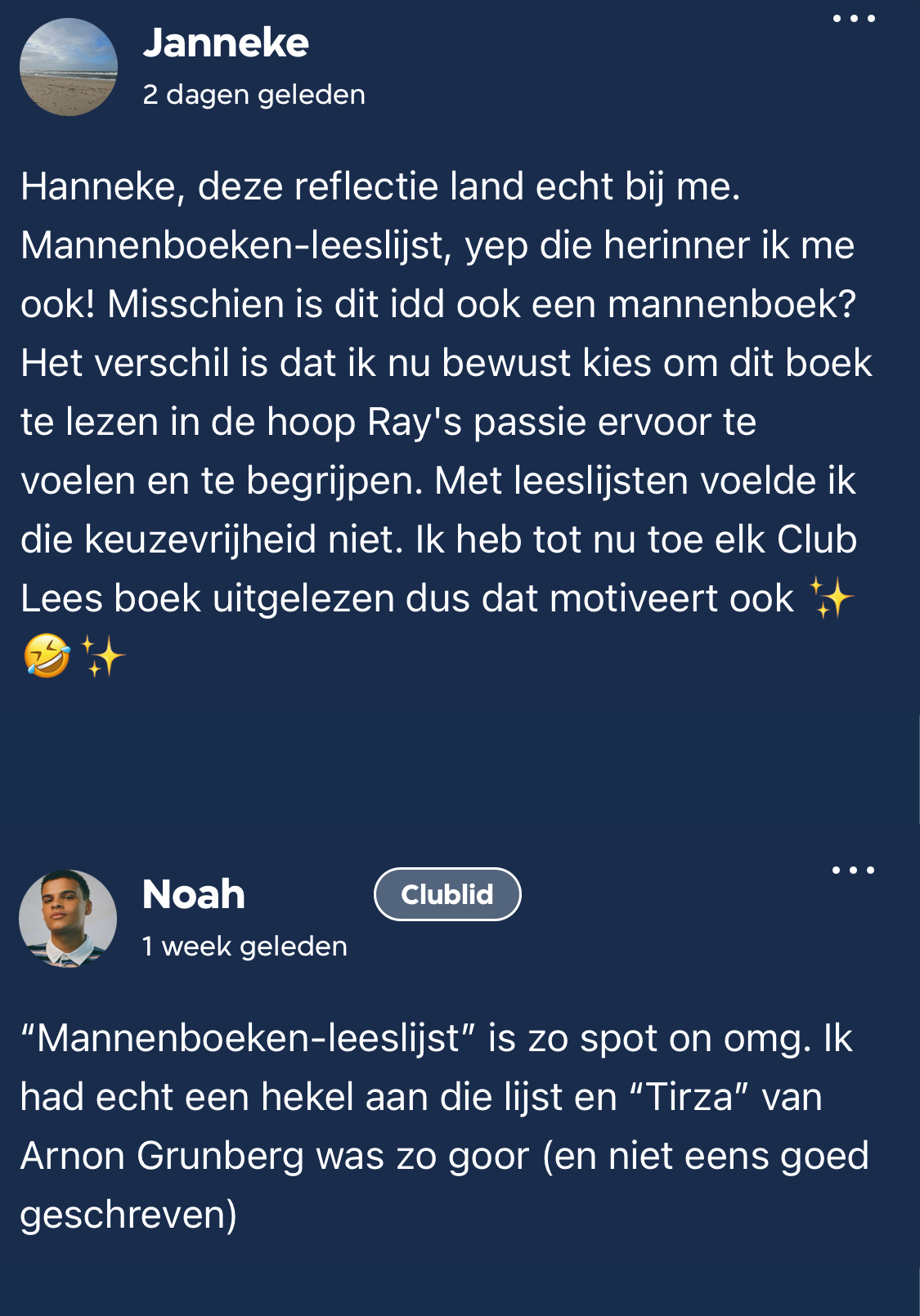 Met de verteller van het boek beleef je verschillende herinneringen uit zijn verleden en daar komt óók seks bij kijken. Of nou ja, het mannelijke perspectief ervan: “De mate waarin zijn erecties, zaad en piemel hem bezighouden, brings me back to Arnon Grunberg, Jan Wolkers, Tommy Wieringa… de middelbare school mannenboeken leeslijst”, merkt Hanneke op in de kantlijn, “Het irriteert me vooral omdat er zo weinig boeken op de lijst stonden over natte vulva’s, baarmoeders en menstruatiebloed. Dit is natuurlijk ook veel meer in de ‘taboesfeer’.” Dit is iets wat niet alleen Hanneke op viel.