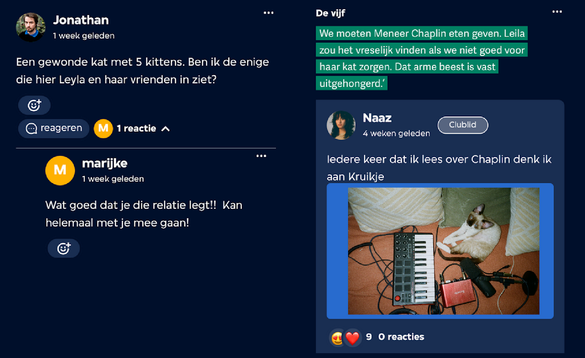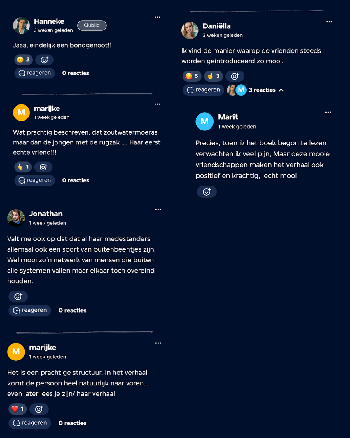 In de online meetup vertelt een van de lezers hoe zij een scène heel goed voor zich zag: het moment dat alle vrienden van Leila samen in haar appartement haar spullen gaan uitzoeken: ‘’Ik zag ze roken in het raam, ik zag ze voor me samen in de woonkamer. Dat was zo mooi.’’