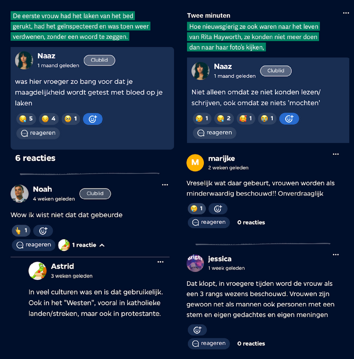 Als Naaz tijdens de meetup wordt gevraagd hoe zij de maand heeft ervaren zegt ze: ‘’Het was voor mij erg bijzonder dat er hele gesprekken ontstonden onder mijn annotaties, soms met inzichten die ik zelf nog niet had. Dat was het leukste eraan." Bij de laatste annotatie in de app delen de lezers hun ervaring: