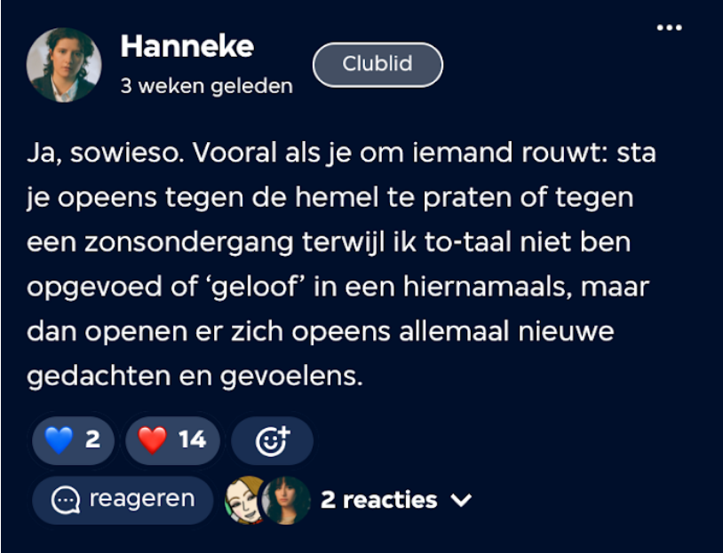 In de kantlijn stroomden de antwoorden binnen. Een van de andere clubleden, Hanneke, reageerde met een antwoord zo mooi, dat Naaz het in de online meetup aanhaalt als een van de mooiste reacties op haar annotaties: ‘’Het bleef me bij, hoe mooi jij naar de dood en rouw kijkt.’’