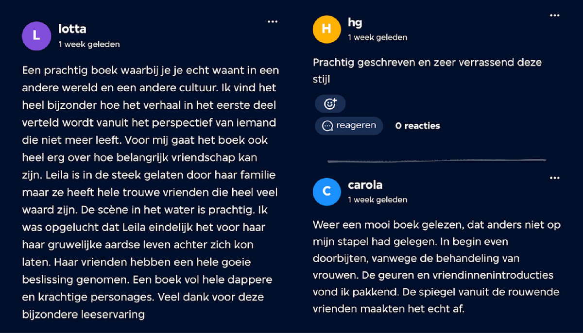 Het eerste boek van Club Lees, 10 minuten en 38 seconden in deze vreemde wereld van Elif Shafak, zit erop! Een maand lang (20 oktober-19 november 2023) werd er meegelezen door de app gebruikers en de clubleden. Het boek werd aangevuld met annotaties van Naaz. De annotaties zorgden voor een gesprek tussen lezers in de kantlijn. Op 15 november vond de online meetup plaats, waarin de clubleden en de lezers met elkaar in gesprek gingen. We zetten de mooiste leesmomenten op een rijtje.