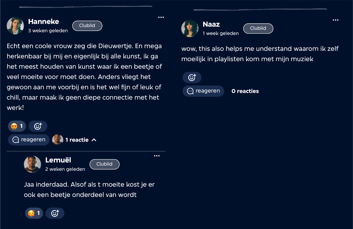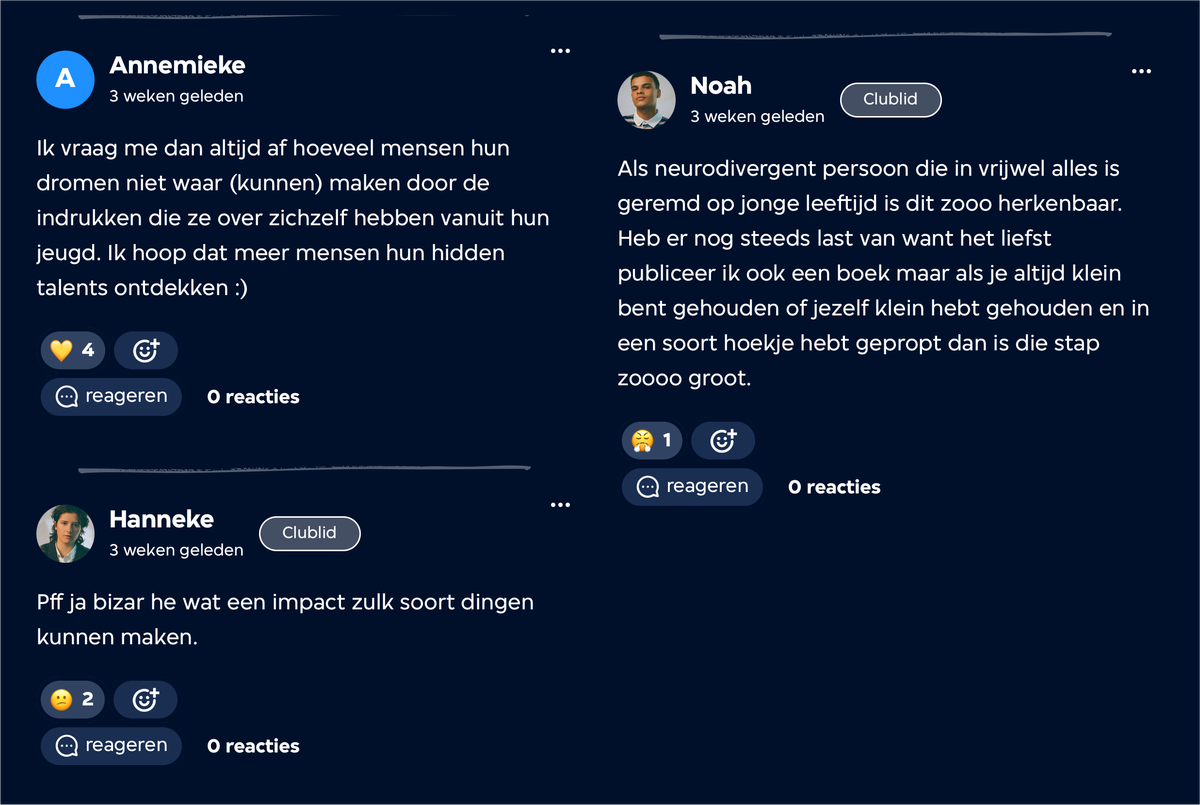 Lemuël interviewt schrijver Dieuwertje Heuvelings, die zelf voor Spotify werkte, over haar boek, maar ook over haar eigen ervaringen als radiomaker. Ze vertelt dat ze pas in haar werkende leven doorkreeg dat als je snel een idee vormt in je hoofd, dat niet meteen een slecht idee hoeft te zijn. Dat kreeg ze namelijk aangeleerd door een basisschooljuf die snel gemaakte handwerkjes een teken van laksheid vond. Integendeel, ze kwam erachter dat haar snelle ideeën juist goed waren. Annemieke vraagt zich in de kantlijn af ‘hoeveel mensen hun dromen niet waar (kunnen) maken door de indrukken die ze over zichzelf hebben vanuit hun jeugd. Ik hoop dat meer mensen hun hidden talents ontdekken :).’ Clublid Hanneke reageert daarop: ‘Pff ja bizar he wat een impact zulke dingen kunnen maken.’ En clublid Noah zegt: ‘Als neurodivergent persoon die in vrijwel alles is geremd op jonge leeftijd is dit zooo herkenbaar. Heb er nog steeds last van, want het liefst publiceer ik ook een boek, maar als je altijd klein bent gehouden (...) dan is die stap zoooo groot.’