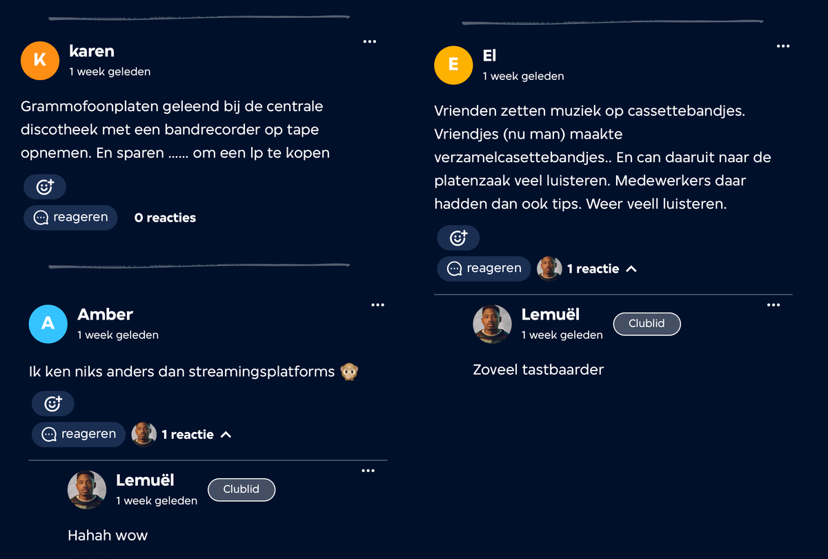 Veel lezers zeiden hun oudere zus of broer te charteren om cd’s te branden met liedjes die van YouTube geript werden. Er werden torrents gedownload en op mp3-spelers gezet. Naaz geeft met een huilende emoji toe dat ook zij haar broers opdroeg liedjes te rippen van het internet. Iemand reageert dat ze nooit anders heeft gekend dan streamingsplatformen. En wat meer terug in de tijd hadden lezers een casetterecorder naast de radio staan en zodra er een leuk liedje kwam, drukten ze op record, maar dan mis je altijd het begin van de track. En nog eentje uit de oude doos: grammofoonplaten lenen bij de discotheek en met een bandrecorder op tape opnemen. Ja, vroeger moest je er heel wat meer voor doen dan nu om je eigen mixtapes te maken.